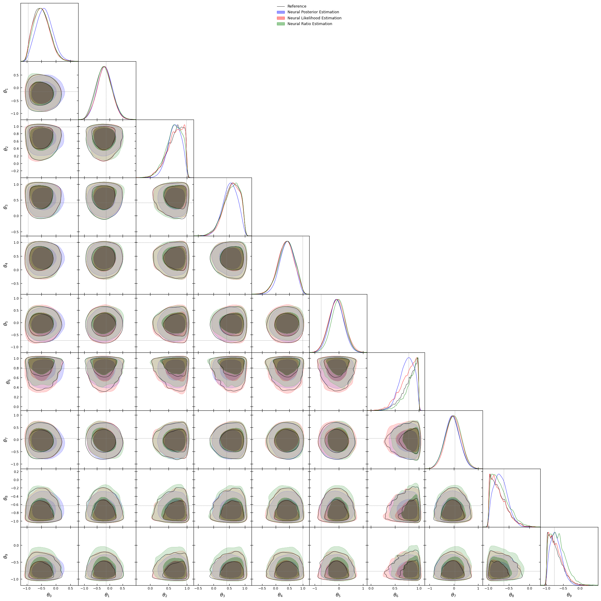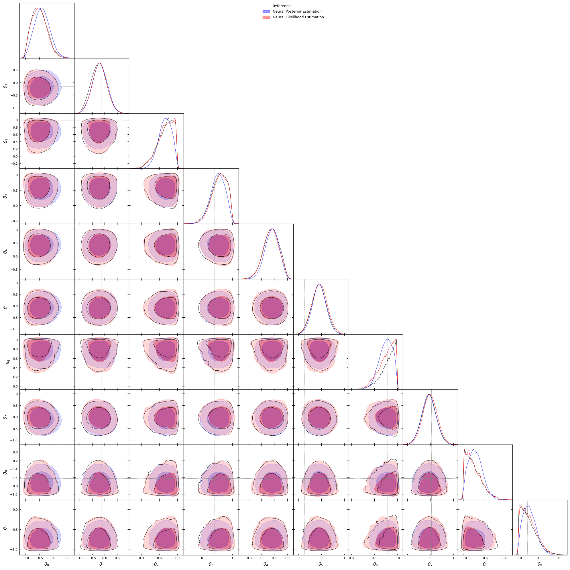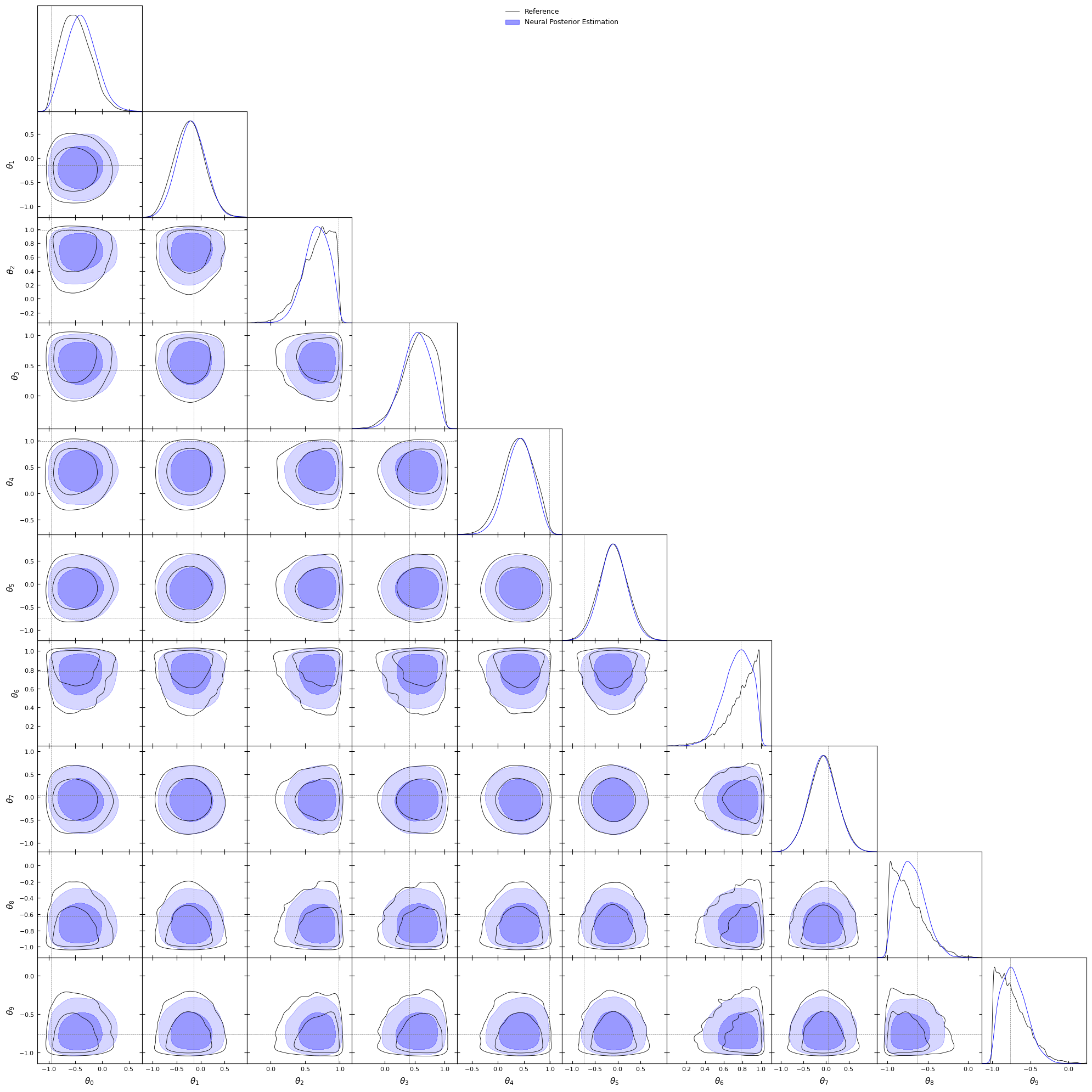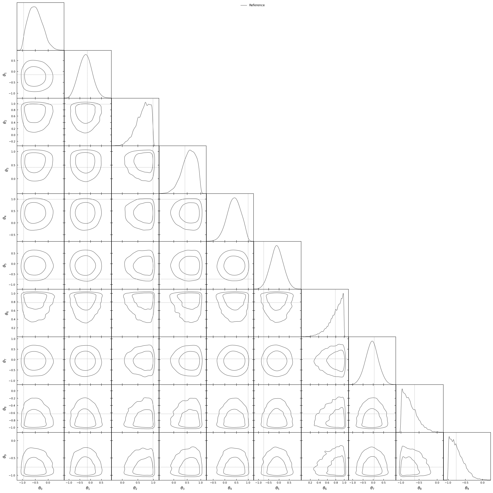 #Let's have a look at the target, we will plot#distributions using getdistlabels = [rf'\theta_{i}'for i inrange(10)]reference_samples_gd = MCSamples(samples=reference_samples.numpy(), names=labels, labels=labels)g = plots.get_subplot_plotter()g.settings.figure_legend_frame =Falseg.settings.alpha_filled_add =0.4g.triangle_plot([reference_samples_gd], filled=[False], legend_labels=["Reference"], line_args=[ {'color': 'black'}, ], contour_colors=['black'], markers={ label: val for label, val inzip(labels, truth) } )plt.show()