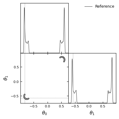 #Let's have a look at the target, we will plot#distributions using getdistlabels = [rf'\theta_{i}'for i inrange(dim_theta)]reference_samples_gd = MCSamples(samples=reference_samples.numpy(), names=labels, labels=labels)g = plots.get_subplot_plotter()g.settings.figure_legend_frame =Falseg.settings.alpha_filled_add =0.4g.triangle_plot([reference_samples_gd], filled=[False], legend_labels=["Reference"], line_args=[ {'color': 'black'}, ], contour_colors=['black'], markers={ label: val for label, val inzip(labels, truth) } )plt.show()