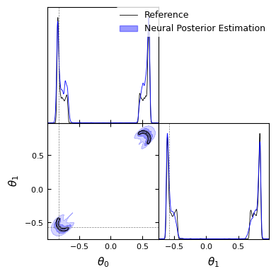 The learned posterior is said to be amortized as it returns a posterior for any observation \(x\) provided. Let’s try to use the observation provided by sbibm and check if we recover the correct distribution.