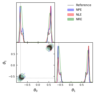 We can see that on complex distributions, density estimators seems to have better performance than NRE. It’s also important to highlight that the performance of the NLE with respect to the NPE depends on the choice of the sampler.