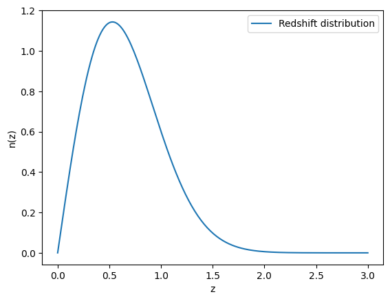 #The power spectrum depends on the cosmology but also on the redshift distribution of galaxies.*#Let's create a simple redshift distributionnz = jc.redshift.smail_nz(1., 2., 0.75, gals_per_arcmin2=30)#and let's have a look at the redshift distributionz = np.linspace(0, 3, 200)plt.figure()plt.plot(z, nz(z), label='Redshift distribution')plt.xlabel('z')plt.ylabel('n(z)')plt.legend()plt.show()