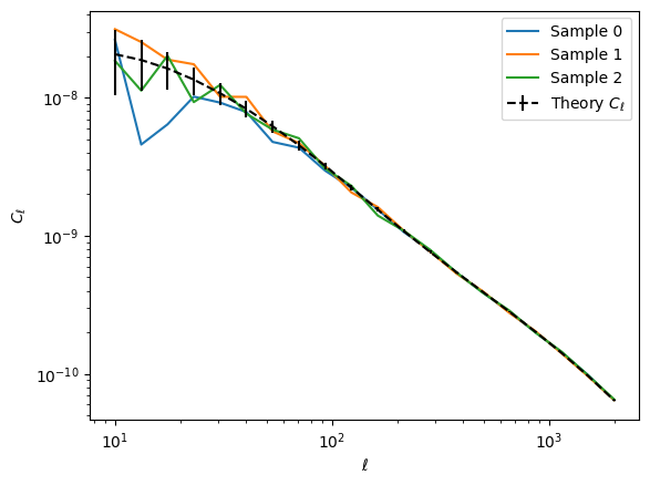 #Let's sample a few Cl's from this distributionkey = jax.random.PRNGKey(42)plt.figure()for i inrange(3): key, _ = jax.random.split(key) Cl = jax.random.multivariate_normal(key, mu, cov) plt.plot(ell, Cl, label=f'Sample {i}')plt.errorbar(ell, mu, yerr=jnp.sqrt(jnp.diag(cov)), label=r'Theory $C_{\ell}$', color='k', linestyle='--')plt.xlabel(r'$\ell$')plt.ylabel(r'$C_{\ell}$')plt.legend()plt.xscale('log')plt.yscale('log')plt.show()