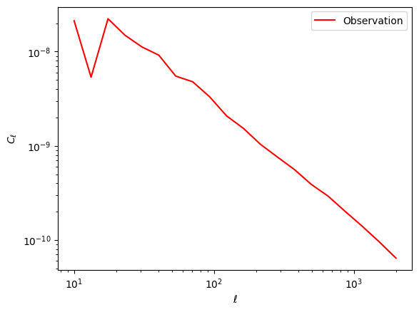 #Let's fetch an observation from the simulatorkey = jax.random.PRNGKey(0)observation = simulator(fiducial_params, key)plt.figure()plt.plot(ell, observation, label='Observation', color='red')plt.xlabel(r'$\ell$')plt.ylabel(r'$C_{\ell}$')plt.legend()plt.xscale('log')plt.yscale('log')plt.show()