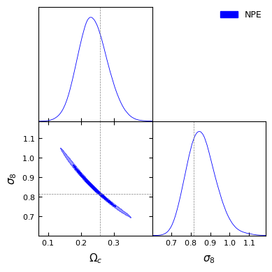 #And have a look at the posteriorlabels = [r'\Omega_c', r'\sigma_8']npe_samples_gd = MCSamples(samples=npe_samples, names=labels, labels=labels)g = plots.get_subplot_plotter()g.settings.figure_legend_frame =Falseg.settings.alpha_filled_add =0.4g.triangle_plot([npe_samples_gd], filled=[True], legend_labels=["NPE"], line_args=[ {'color': 'blue'}, ], contour_colors=['blue'], markers={ label: val for label, val inzip(labels, fiducial_params) } )plt.show()