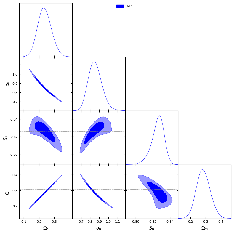 #And have a look at the posteriorlabels = [r'\Omega_c', r'\sigma_8', r'S_8', r'\Omega_m']npe_samples_gd = MCSamples(samples=npe_samples, names=labels, labels=labels)g = plots.get_subplot_plotter()g.settings.figure_legend_frame =Falseg.settings.alpha_filled_add =0.4g.triangle_plot([npe_samples_gd], filled=[True], legend_labels=["NPE"], line_args=[ {'color': 'blue'}, ], contour_colors=['blue'], markers={ label: val for label, val inzip(labels, fiducial_params) } )plt.show()
