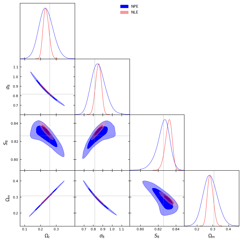 We can see that NPE is unbiased and accurately captures the degeneracy between \(\Omega_m\) and \(\sigma_8\). NLE is biased and does not capture those degeneracies. This might be due to two things: - a bad choice of training hyperparameters. - A data vector that is too large leading to curse of dimensionality. In that case, compression has to be used.